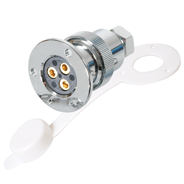 1852, Abdeckungsstecker 3-polig, 3 Amp, 12V, Messing verchromt mit Dichtung und Kunststoffabdeckung auf Kette