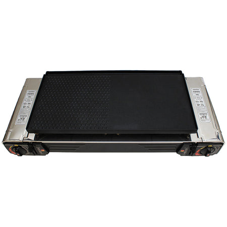 Mit dem 1852 Doppelküchen-/Gasbrenner mit Grillplatte erhalten Sie eine praktische und vielseitige Lösung für das Kochen, egal wo Sie sich befinden. Dieses kompakte Kochgerät kombiniert Kochplatten und Grill, sodass Sie köstliche Gourmetgerichte unter freiem Himmel zubereiten können.