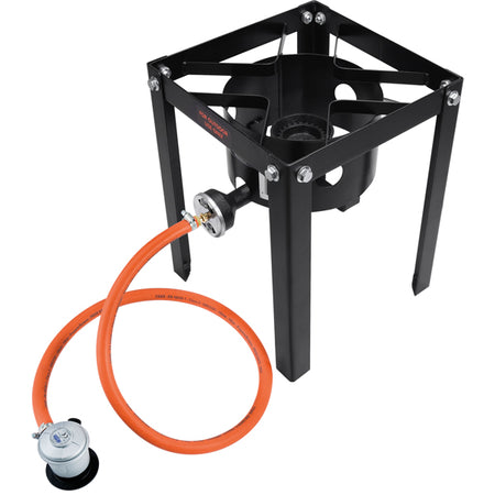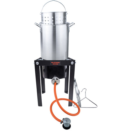 - Inhalt: Gasbrenner, Schlauch mit Regler, Stativ, Aluminiumpfanne (40 Liter), stabile Innengitter