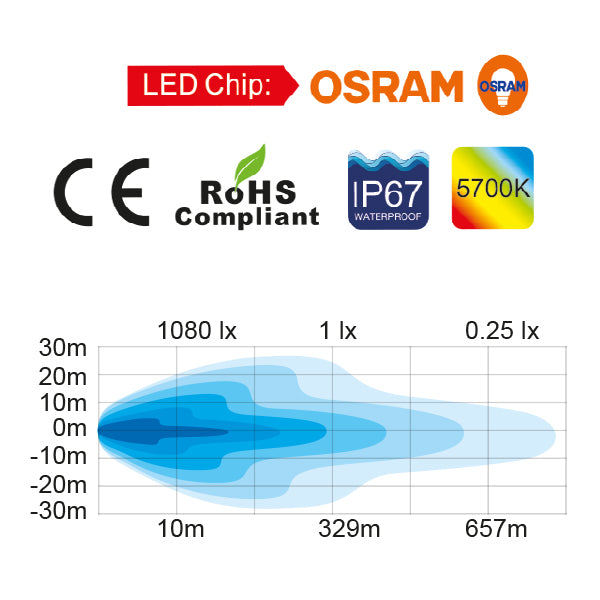 - Lux bei 10 Metern: 1080 Lux