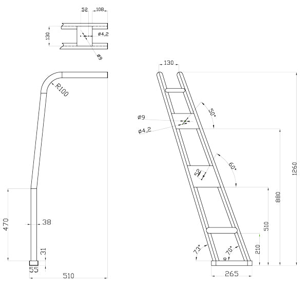 1852, Tara-Stab RF, 70°-Winkel, AISI 316, Breite 145-230 cm, Höhe 126 cm