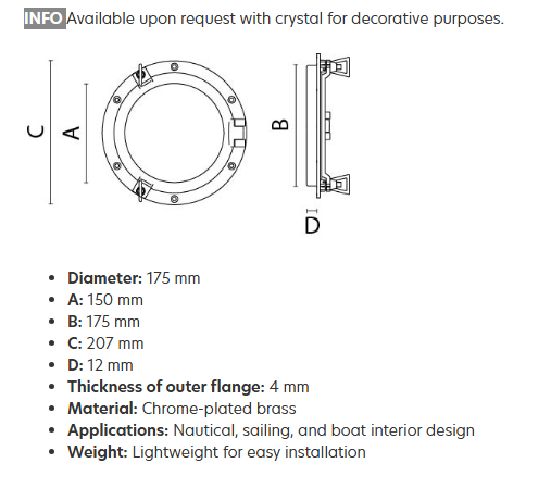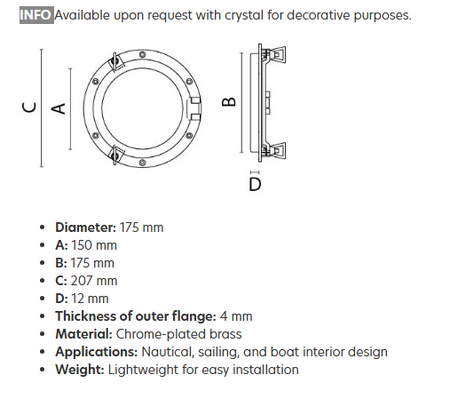 Verleihen Sie Ihrem Boot mit diesem eleganten Kojenfenster aus Chrom einen modernen Touch. Mit einem Durchmesser von 207 mm ist dieses Koje ideal für kleine und große Boote und sorgt für ein ansprechendes maritimes Ambiente.