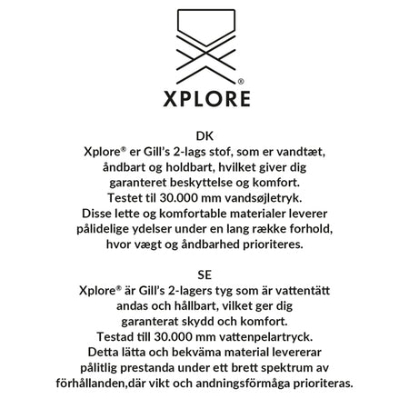 - Vandtæthed: XPLORE® 2-lags vandtæt stof med tapede sømme