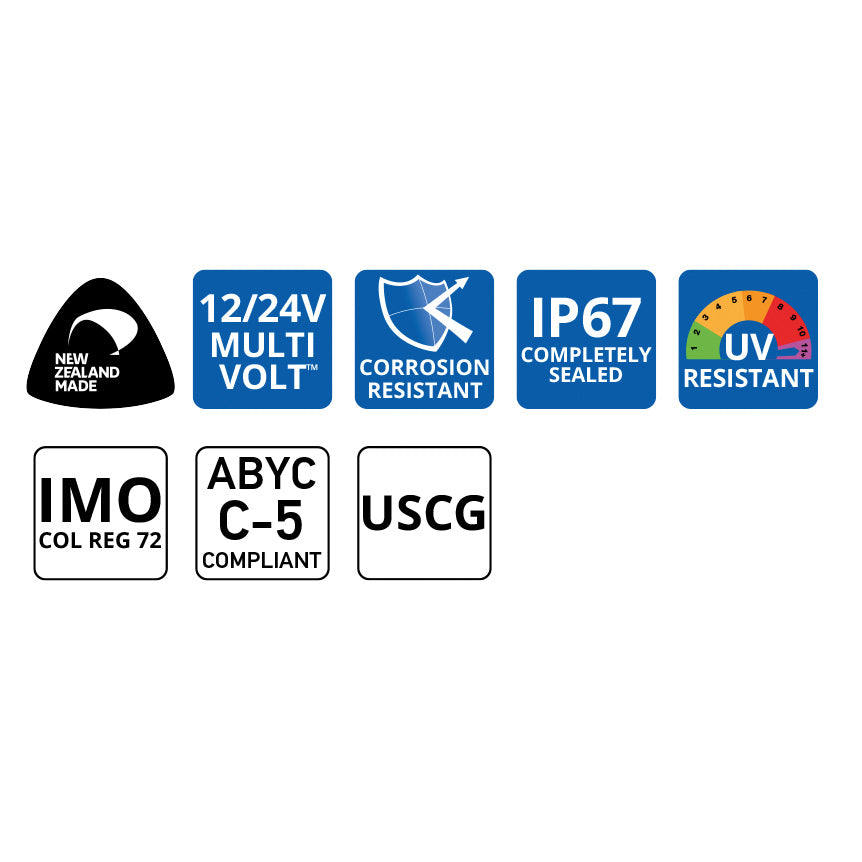 Serien er certificeret ABYC C-5-standard, som stiller strengere krav til optisk ydeevne.