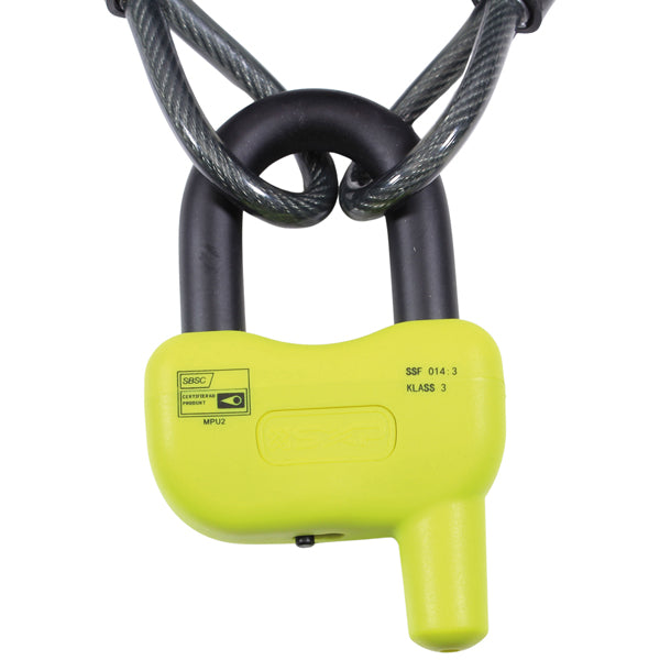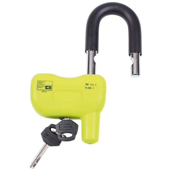 Den inkluderede bøjlelås er klassificeret i FG klasse 3, hvilket giver en høj sikkerhedsgodkendelse. Den er designet i en let synlig farve og har en bøjle, der altid er fastgjort til låsekassen på den ene side, hvilket reducerer risikoen for at miste komponenterne.