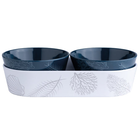 MB Living snack sæt består af 3 praktiske dele i melamin med et elegant koralmønster i marineblå og beige nuancer. Sættet indeholder to skåle og en bakke, der er fremstillet af 100% melamin, hvilket gør dem særdeles holdbare og velegnede til daglig brug.