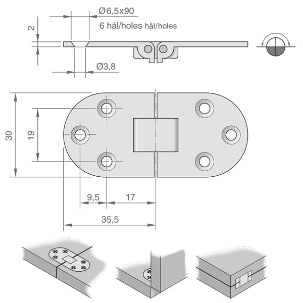 Roca, Tischscharnier 180º, Messing verchromt, 71 x 30 mm