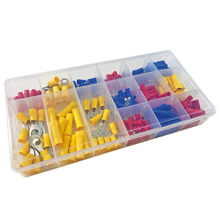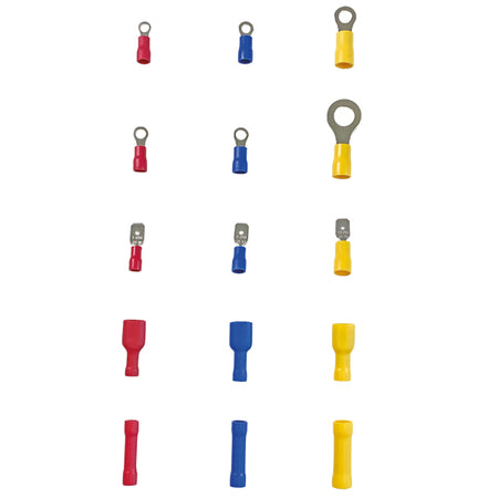 - Inhalt: Ringklemmen, isolierte Flachstecker, Kabelverbinder und flache Stecker