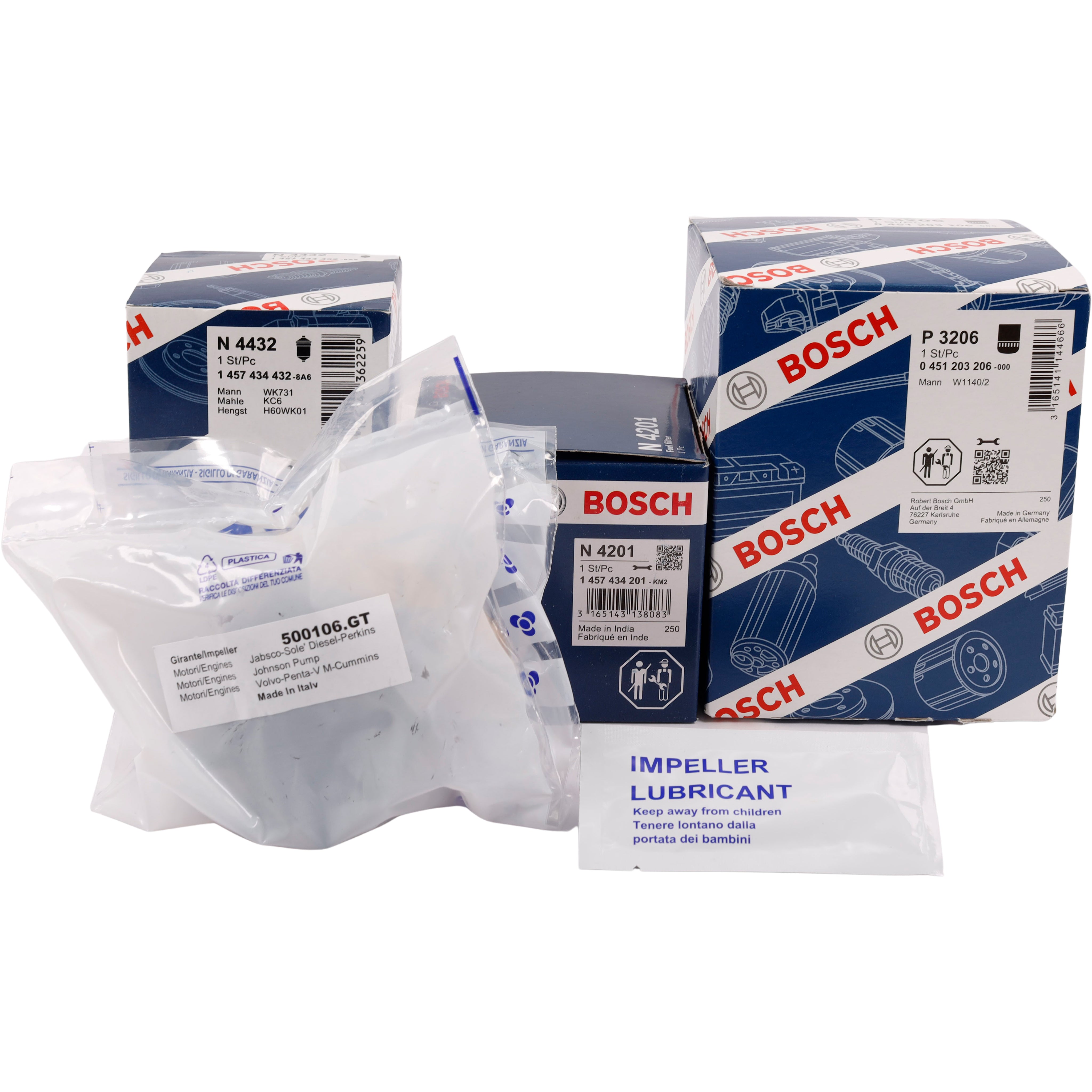 - Filtre og komponenter: Inkluderer Bosch brændstoffilter N4201 og N4432, Bosch oliefilter P3206, og en impeller (500106GT) med tilhørende impeller fedt (5g).