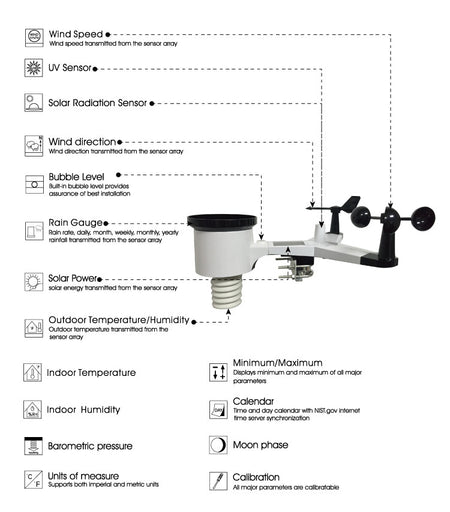 Die Wetterstation misst Temperatur, Luftfeuchtigkeit, Windrichtung, Windgeschwindigkeit und Niederschlag, was sie zur idealen Lösung für Hobby-Meteorologen und alle macht, die auf das Wetter vorbereitet sein möchten. Sie können auch Minima- und Maximalwerte speichern sowie Alarme für spezifische Bedingungen einstellen.