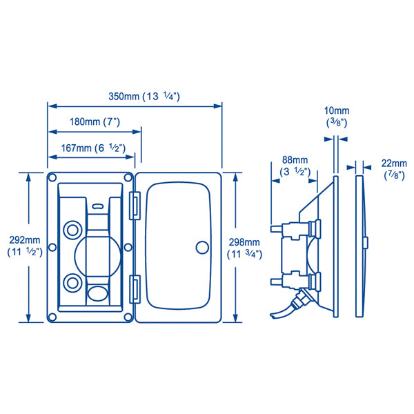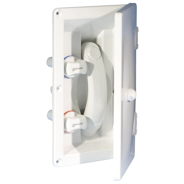 Die Dusche kann mit oder ohne Abdeckung montiert werden. Die schön schwenkbare Abdeckung mit Schloss sorgt dafür, dass alles ordentlich bleibt. Der Anschluss ist einfach und kann entweder an Whale Quick Connect 15 mm Rohrleitungen oder an eine ½" Schlauchverbindung angeschlossen werden. Die Whale Dusche ist so konzipiert, dass sie sowohl kaltes als auch warmes Wasser bewältigen kann, was sie vielseitig für verschiedene Bedürfnisse macht.